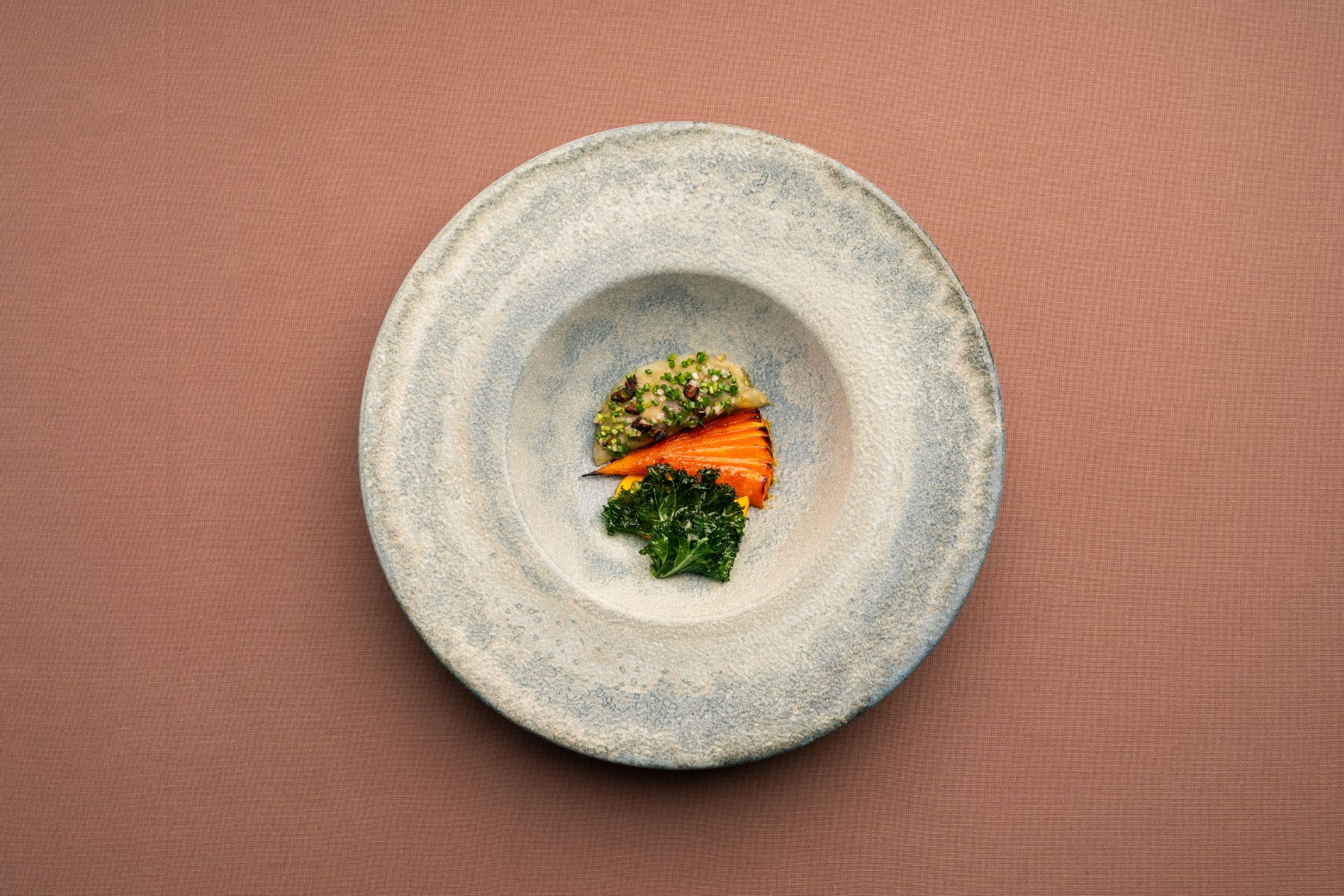 Bagt red chatenay, knoldselleri garniture fyldt m. shiitake og grønne linser og friske urter. Red chatenay puré, blancheret grønkål og en sauce på gulerod, ingefær og chili.